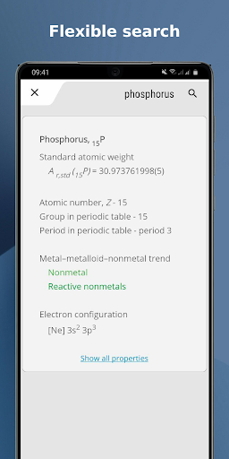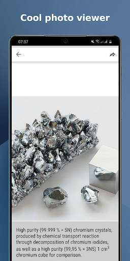All data is structured and displaying in a convenient form. There is a photo gallery available for each element of the periodic table. We developed a quick search system, including voice-search, for fast convenient access to necessary information of elements properties values.