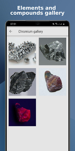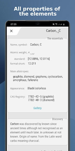 application, except for elements' photo-galleries, are available without an internet connection. You may use day or night themes. You can share all search results, gallery images, and other elements data with friends and acquaintances.