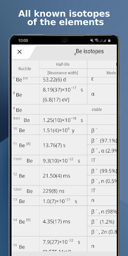 The application contains a database of more than 5000 isotopes and isomers of the elements of the Periodic table. The following information is available for isotopes: