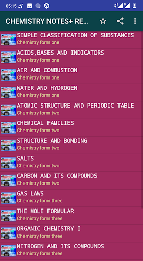 The appliction features the chemistry notes from form one to form four. Topical revision questions and answers have been provided to help the user navigate smoothly.
