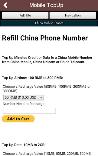 China Mobile Top Up - Mobile Airtime & Data Recharge application allows users to purchase credit for prepaid airtime or data, conveniently and securely. Simply select the amount to be topped up in US Dollars, we will display the amount that will be reloaded, proceed to payment and pay using Paypal. Without being a Paypal member, you also can pay credit cards via Paypal platform. Once payment is successfully processed, airtime is topped up within two hours and you are notified via email.