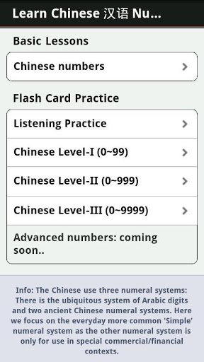 • Chinese Numbers Fast: Is a great tool, on the go reference and study guide for learning Chinese numbers. Provides full Chinese audio pronunciation and a mini game to help you improve your Chinese number skills quickly.