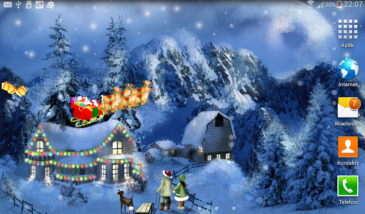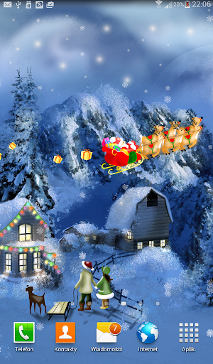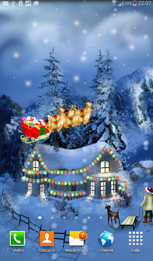 Live Christmas Wallpaper with physics snowflakes, flying Santa dropping gifts and switchable lights on house and trees.