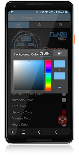 ✔ Color picker to select any color you like for the background, clock hands, text, & numbers