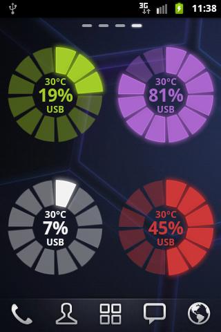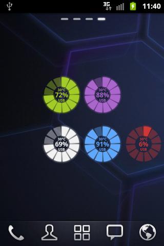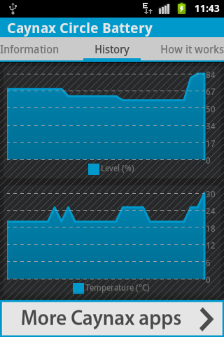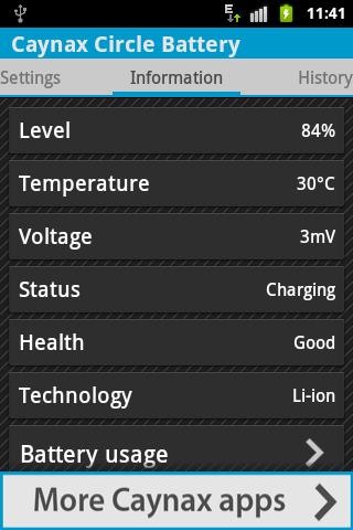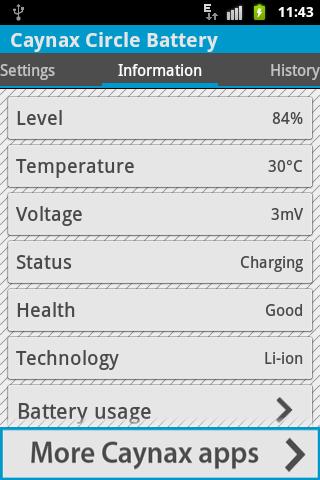 Caynax Circle Battery widget Beautiful free circular battery widget. Battery disc shows information about battery level, temperature voltage, status, health, technology. Includes battery monitor that shows battery usage history on charts.Application is adsupported. Displays banner ads and push ads ads in notification bar only once every 2.5 days.check Privacy Policy for permissions description.
