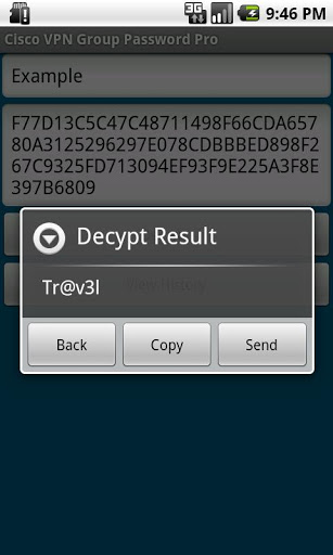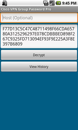 Decrypt Cisco VPN client encrypted group passwords found in the .pcffilesFeatures Decrypt Cisco VPN Client encrypted group passwords found in the .pcffiles Results can be easily copied. Results can be easily shared via Email and SMS. PRO version only Result are saved in history for future reference. PRO version only Store other information such as the host and the group name PRO version only Import a Cisco VPN Client profile .pcf file from a SD Card PRO version only NO ADVERTS PRO version onlyThese are the password you will find in a Cisco VPN Client .PCF file next following encGroupPwdFor example:encGroupPwd8138E574B252A70E762F154681338E777C9CE2EE51C317A233AE807825E5018F516332B27D8965051D39CEAA95548EE7Will decrypt tok4m1ts5