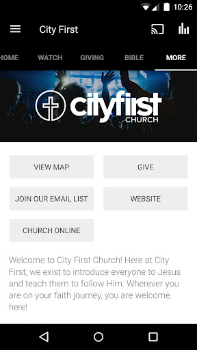 Welcome to the official City First Church app! This app will help you stay connected to everything that’s happening at City First Church.