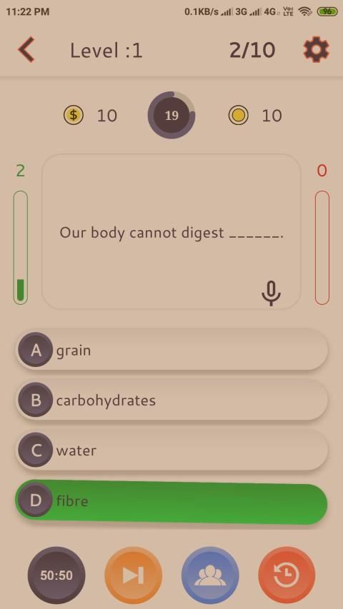 In every subject there are quiz levels. In each levels there are 10 questions. While playing quiz, questions will be displayed with four options. Select the option which you think is the correct answer. If your answer is correct the option you selected will be highlighted with green colour. If it is wrong then it will be highlighted with red colour and correct answer will be highlighted with green colour.