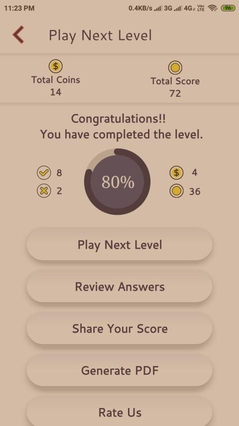 After attempting all the questions result will be displayed. You must answer atleast 6 questions correctly to move to the next level.