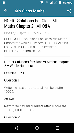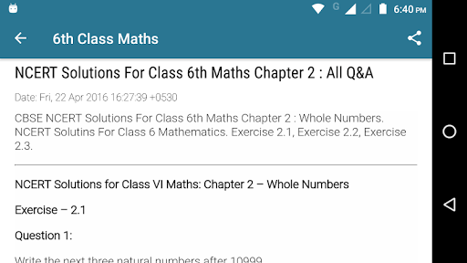 Class 6 Maths Solution NCERT provides solution of all chapters and exercise of CBSE class 6th NCERT Maths. This app is very easy to use. Class 6 Maths CBSE Solutions app is specially designed for the CBSE / NCERT class 6 students to help them prepare for their exams. It also helps them throughout the year to complete their homework on time and double check the answers.