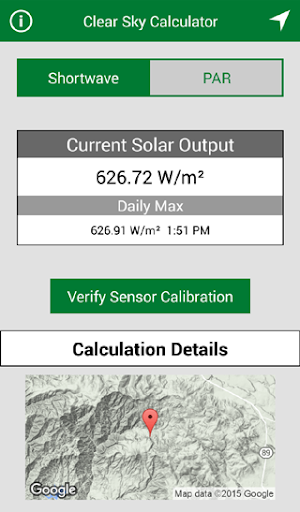 The Clear Sky Calculator is used to determine the need for recalibration of radiation sensors. It is most accurate when used near solar noon in the summer months. The calculator estimates the intensity of solar radiation (either total global shortwave radiation, measured by pyranometers, or global photosynthetic photon flux density, measured by quantum sensors) incident on a horizontal surface at any time of the day, at any location in the world. The equations used to estimate clear sky solar radiation with the Clear Sky Calculator come from the clear sky solar radiation model used to calculate net radiation in the ASCE Standardized Reference Evapotranspiration Equation (http://www.kimberly.uidaho.edu/water/asceewri/index.html). The only input requirements to the calculator are site elevation, latitude, longitude, reference longitude, and air temperature and relative humidity measurements or estimates. These data are typically easy to obtain, making the Clear Sky Calculator a simple solar radiation reference that can be used to estimate pyranometer and quantum sensor accuracy and determine the need for recalibration.