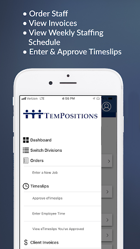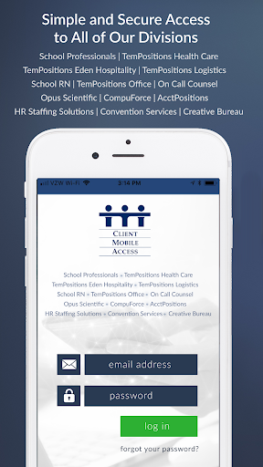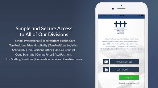 This is the official Client Mobile App of The TemPositions Group of Companies- consisting of School Professionals, School RN, On Call Counsel, Opus Scientific, CompuForce, AcctPositions, HR Staffing Solutions, Convention Services and the Creative Bureau. This app enables you to complete many of the tasks you would do on our CWA portal right from your mobile device.