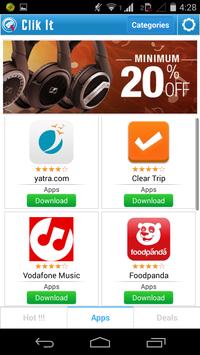 No need to search among millions of apps and deals to find what you like. Clik It will do it for you. A simple click is all you need to download applications and avail HOT deals and offers.