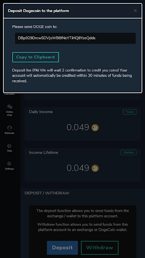 The daily interest rate is 0.49% of the deposit amount. Every day you will be charged a percentage of the contribution. Approximate income per annum from investments will be 182% - per month 15.19%.