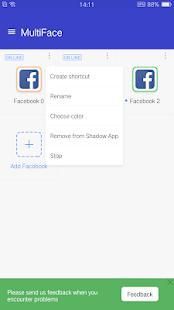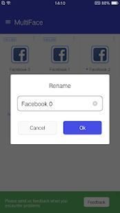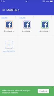 Now Clone app & multiple accounts for Facebook - MultiFace is created for users to log on multiple accounts. Try MultiFace NOW! With MultiFace, you can login multiple identities of apps at the same time on one device. Meanwhile it also can protect your privacy of using the apps and keep the apps secure in the device.