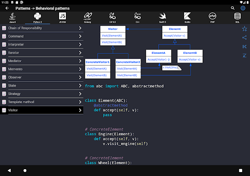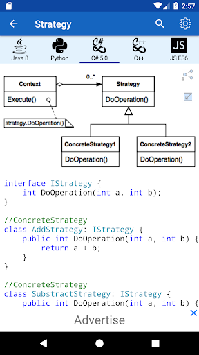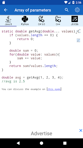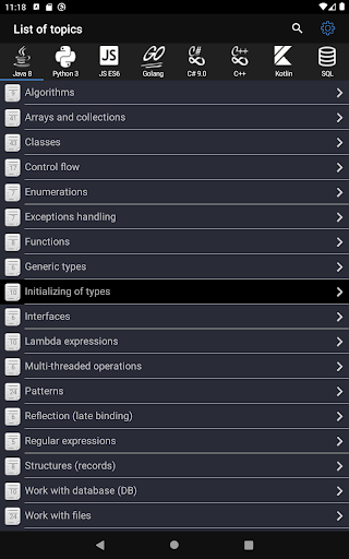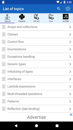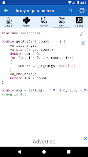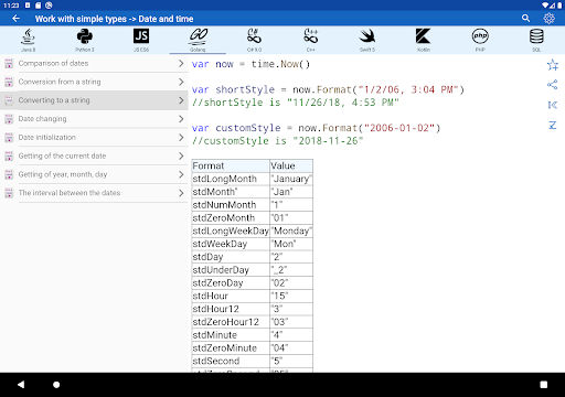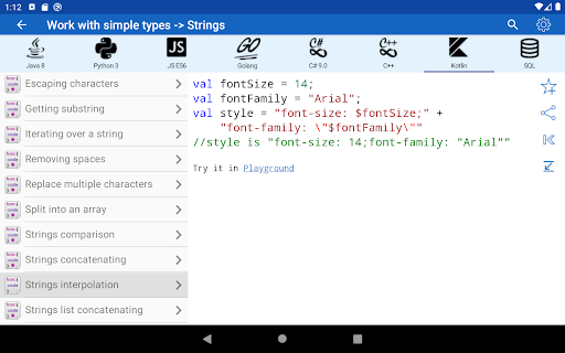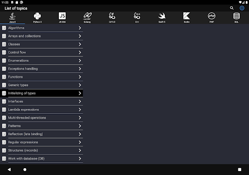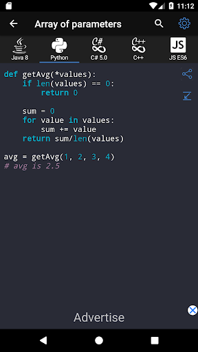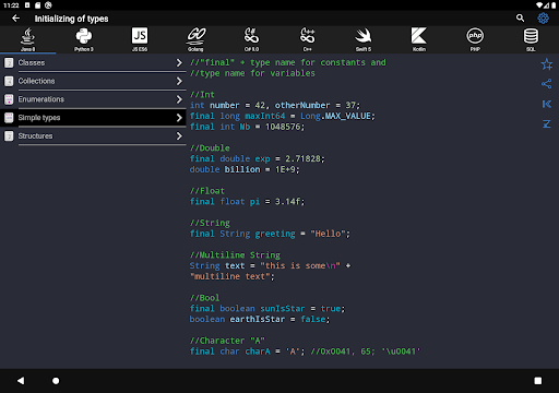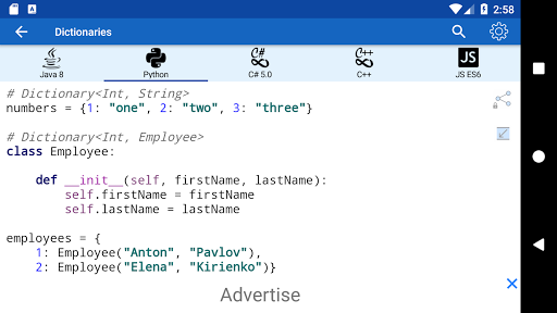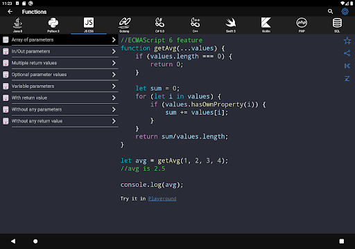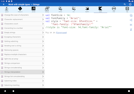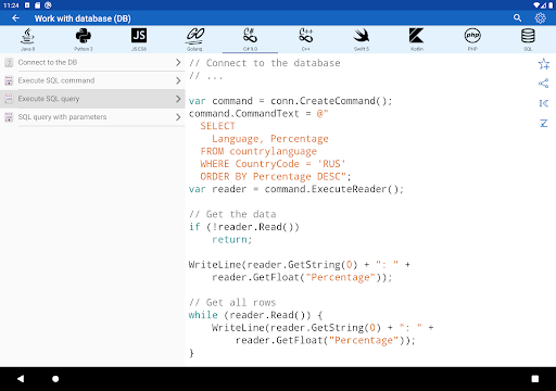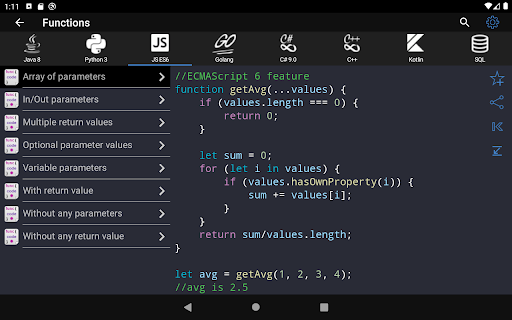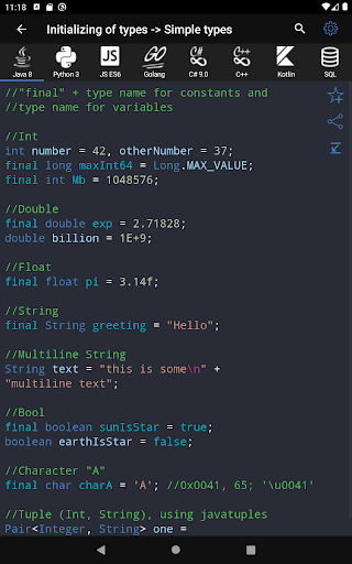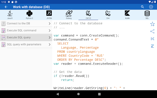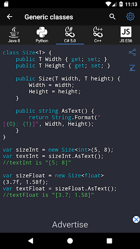 ✓ Learning language syntax on specific code examples. How to get a substring? How to declare a generalized method? These and over 250 of other code samples for each language are available in the application.