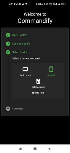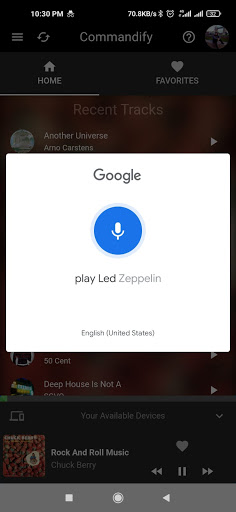 By using voice prompts Commandify can conveniently play songs and playlists, add songs to playlists, find albums and artists and get "Recently Recommended" tracks and even toggle media playback between your Spotify enabled media devices.