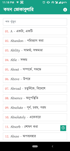 Common Vokabeln ist eine englische in Bangla-Vokabular-App.Diese App erhielt die am häufigsten verwendeten Wörter.Außerdem gibt es Optionen, um das Vokabular zu durchsuchen.Neben dem Lernen von Vokabeln durch diese App können Sie online auf dem Vokabular testen.Die App ist in: