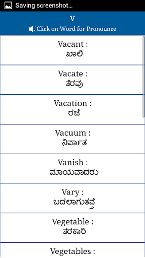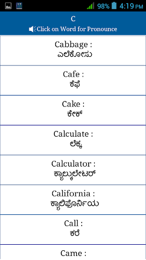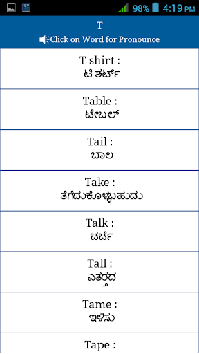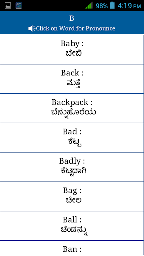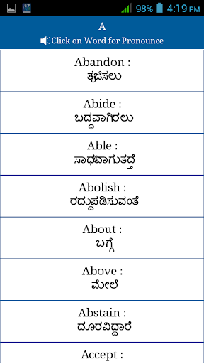 Common words English to Kannada with pronounce or sound .This app help you to learn very common words, daily necessary words , must known English to Kannada words , Vocabulary , Spoken English to Kannada and Simple words .