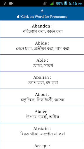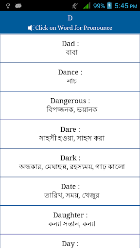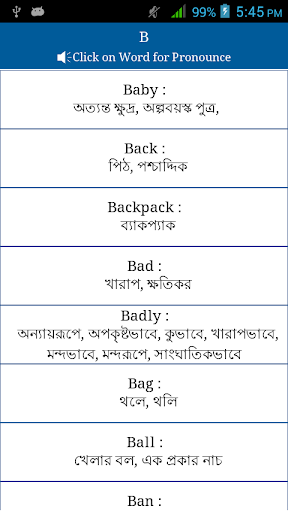 Common words English to bangla with pronounce or sound .This app help you to learn very common words, daily necessary words , must known English to bengali words , Vocabulary , Spoken English to Bangla and Simple words .