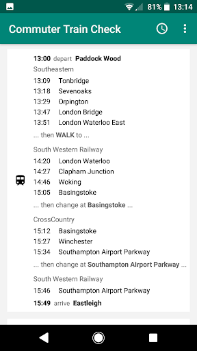 Each journey must be for a direct train service, but you can specify up to 3 different journey legs. The app will present the different potential train combinations you can take, given the latest live times. The time you will have to make each connection is also presented, allowing you to work out if you have a chance of actually making the connection.