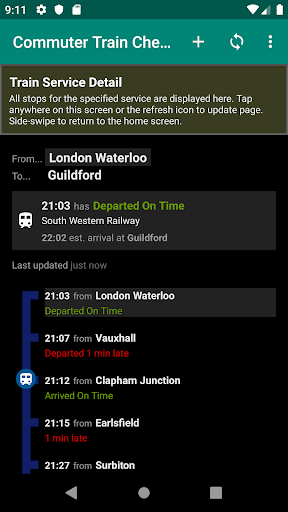 Tap on any individual train service to see a detailed breakdown of all the station stops on that service, along with the live train time status at each stop. This detail is shown on a screen to the right of the home screen, and you can side-swipe between the two screens. These two screens are related, but separate, meaning you can keep an eye on the detailed status of a train on the detail screen (refreshing it periodically) whilst swiping back to the home screen to look at the status of all the train services for that journey.