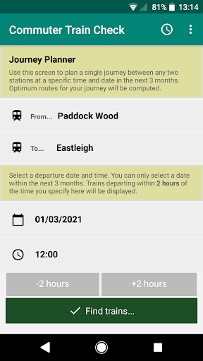 Added Journey Planning functionality in a new screen to the left of the home screen (swipe right, or use the calendar icon in the title bar). This lets you see optimal journeys between any two stations in the uk for any specified date/time within the next 3 months. The timetable is updated each night, and the journeys incorporate the officially recognised transfers between stations (via bus, tube, walking etc.)
