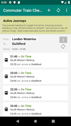 Brilliant app! I enter in my commuting times and this little wonder shows me all the trains on opening! Also really easy to add ad hoc trips and remove them. Bonus, display is intuitive and shows how many minutes a train is delayed by if it is delayed (which as we know, is quite often). Go for it!