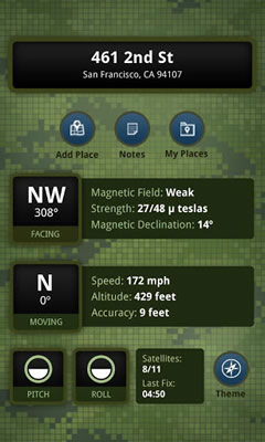 Android39;s leading compass app with location display and geotagged notes.ANDROID39;S LEADING COMPASS APP Featured in Best Android Apps, The Guide for Discriminating Downloaders, published by OReilly Media, Compass by Catch.com is the most popular compass app available.NEVER GET LOSTCompass view with location display and geotagged notes lets you not only steer in the right direction, but view maps and keep notes of the places you visit.REMEMBER IMPORTANT PLACESSave your favorite places home, work place, school, restaurant, shops, etc. or even your car location. Navigate back to them later with Google Navigation.Capture and view your locationbased notes in your area using the free Catch app.CHOOSE FROM MULTIPLE COMPASS TYPES Compass is a free app that includes 5 basic compass types quot;Vintagequot;Antique dial, direction names adjust for user39;s language.quot;Digitalquot;Outer dial can be manually rotated, green inner dial shows direction name in user39;s language, crisp pointer movement with no overshoot.quot;GPSquot;Red section shows magnetic compass information including direction, magnetic field strength and declination.Green sections show GPSbased information including direction of movement, speed, altitude, and accuracy estimate.Pitch and roll indicators.quot;NightVisionquot;Red outline on black styling for easy reading in lowlight conditions.PREPARE FOR ADVENTURENow Compass offers premium compass themes with a simple inapp purchase. Choose from among our Urban Hiker, Space Cowboy, Sea Navigator and Special Ops themes, or buy all four for one low price. Urban HikerHand points up, compass dial rotates underneath it.Shows direction and latitudelongitude below the compass.Paper texture and city skyline background.Special OpsShows magnetic compass information including direction, magnetic field strength and declination.Also shows GPSbased information including direction of movement, speed, altitude, and accuracy estimate.Pitch and roll indicators.Digital camouflage background.Sea NavigatorOuter dial can be manually rotated, inner dial points north with slight overshoot, quot;movingquot; direction below compass.Space CowboyInner digital direction indication with finelymarked outer dial.Dial movement is crisp.Latitude and longitude below compass.Internet permission is used only for Google Analytics so we know which features are used the most and where to improve. There is no unique identifier tied to your usage, and your data is not shared.Note that this app relies on the mobile devices magnetometer so accuracy may vary.