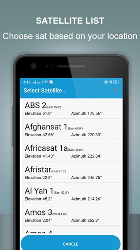 Satellite Finder (Dish Pointer) With Gyro Compass Level, this app is the complete tool for TV Dish antennas. This will give you the correct azimuth elevation and it will provide you with a Clinometers and a Compass bubble level meter for setting up a TV dish antenna (On GPS based). Users can select a satellite from the Users list to determine the direction of the dish antenna. The user can view satellite data such as longitude and latitude and display their position on Google Maps.