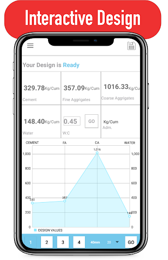 The app uses the IS 10262 2009 code for the concrete mix design and you can design ready mix concrete, the concrete calculator gives you the concrete composition which you can feed to the concrete mixer and make concrete blocks with it.