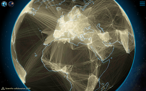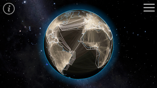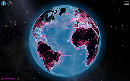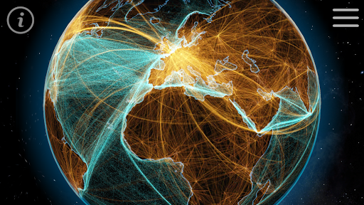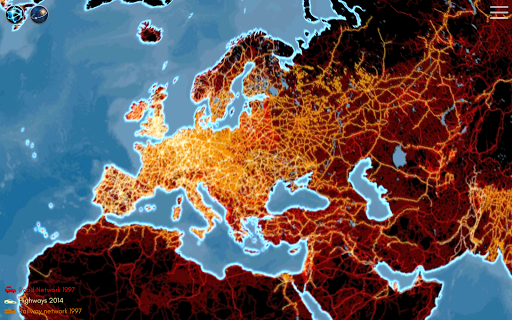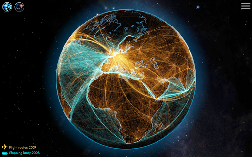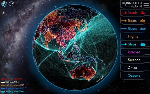 Planet Earth is connected by many ways. Experience connectedness from a global perspective. Overlay roads, railways, navigable rivers, ship lanes and flight routes to find out how we move through the globe. Blend the internet connection layer to see the submarine cables and how the populated areas of the world interact with each other.