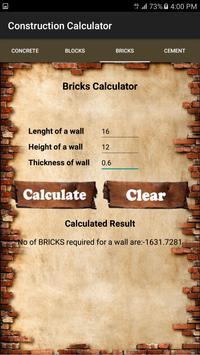 Construction calculator have a section which is made for to calculate how many bricks are used in constructing a wall, the user will make input of length of a wall, height of a wall and width of a wall in feet.