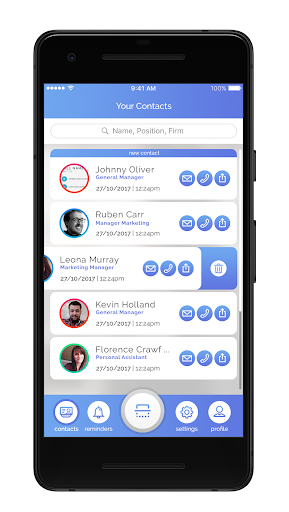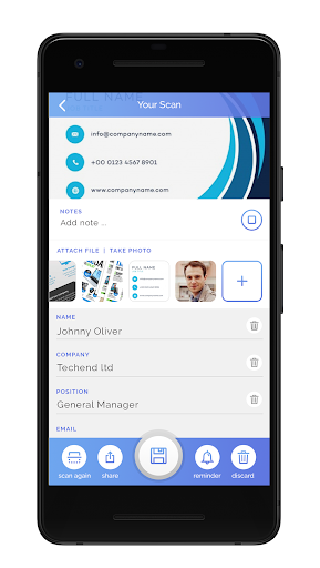 Manage and organize single and multiple contacts and distribute your scanned business cards on the go. Set reminders and voice notes to any contact and synch all the information between devices and teams.