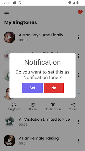 ✔ Set as ringtone, notification sound (for SMS, email and other messages ), or default alarm sound (all you need to do is tap and hold on the desired ringtone and select a desired option from the menu)