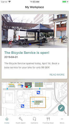 The app allows you - depending on the site you log into - to do everything from reporting faulty office equipment and booking meeting rooms to finding a parking space, where to charge your car, book bicycle services, seeing what's on the menu for lunch and getting the latest updates on what's happening in the office!
