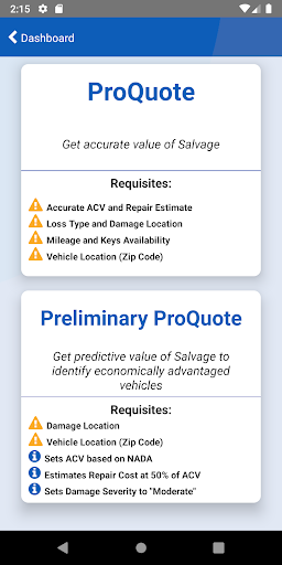 • NEW FEATURE: Preliminary ProQuote can get predictive value of salvage for economically advantaged vehicles with only few details.