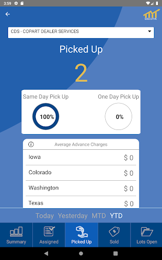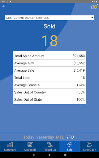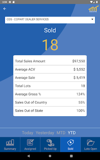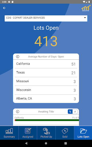 The Executive section keeps our Seller Executives up to date with various key points and values of lots assigned to Copart, using beautiful visualizations and graphs. It is a tool that will help you stay on top of your growth, engagement, and business with Copart, on-the-go.