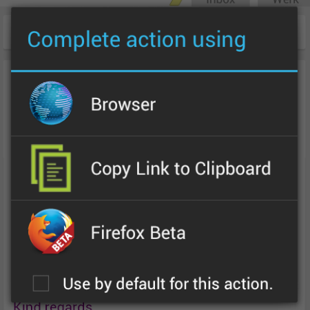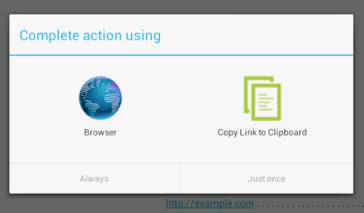 Adds a "Copy Link to Clipboard" option to the browser selection menu and the share menu. After choosing "Copy Link to Clipboard", the URL will be copied to the clipboard and briefly displayed without leaving your previous app.