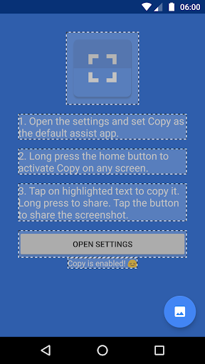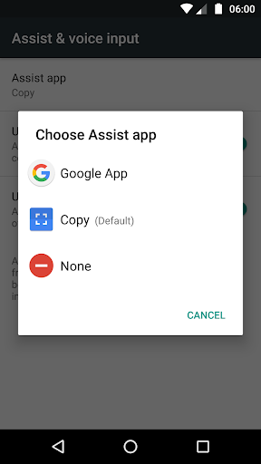6. Devices running Android 7.0 and 7.1 have a bug that breaks the assistant functionality after a reboot. If your device is affected, you have to open the assist settings after rebooting your device. Simply opening the settings will re-enable Copy. As far as I know, all assist apps are affected by this bug, except for the Google Assistant.