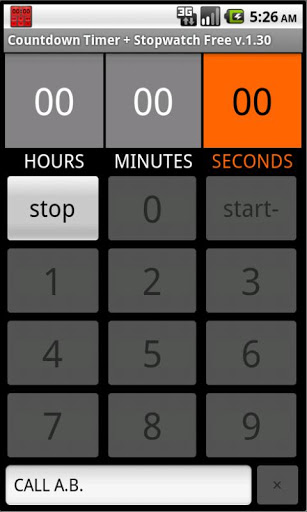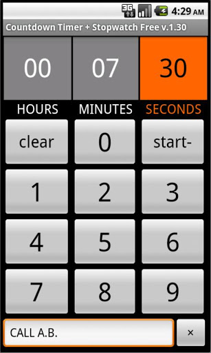 Simple, easy to use Countdown Timer Stopwatch. Enter the time interval, click Start. When expired, a sound/vibrate notification is fired