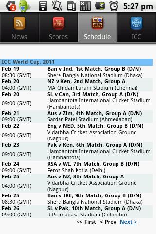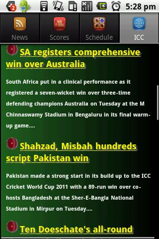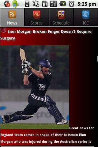 Are you looking for a cricket news application? This is the right application. World cup cricket is around the corner and this app will allow you to check the following on your android phone1 Check the latest photo news of the world cup 2 Check latest scores of matches around the world 3 ICC news section 4 Match schedule for the world cup