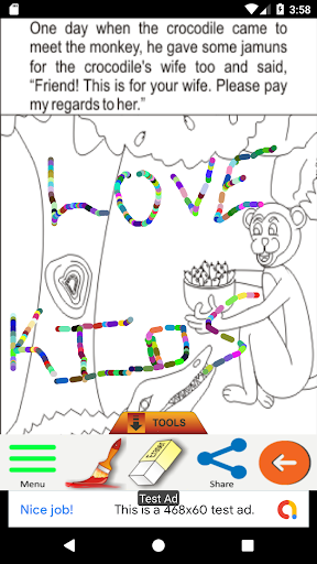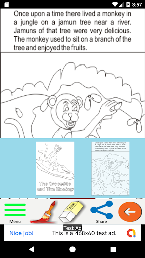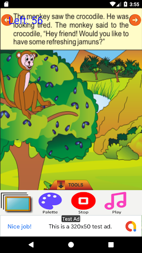 Page 7: After that the crocodile frequently came to see the monkey and the monkey always welcomed him with nice jamuns. They have become good friends.