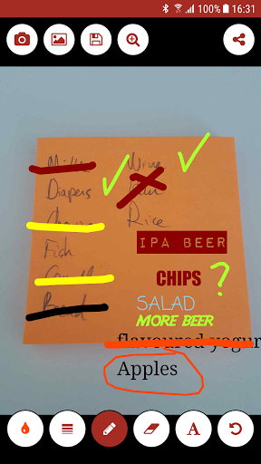 Do you make your shopping list on paper or blackboard? Do you consider it tedious to create and maintain task lists by typing in the mobile? With this app you can take a picture of the board and cross out the elements to your liking and convenience just using your finger. Share your progress with your family and friends to complete it with everyone.