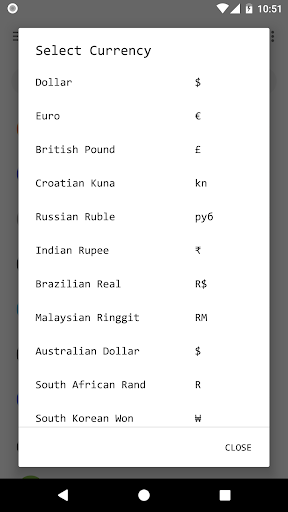 Dollar, Euro, British Pound, Croatian Kuna, Russian Ruble, Indian Rupee, Brazilian Real, Malaysian Ringgit, Australian Dollar, South African Rand, South Korean Won, Canadian Dollar, Japanese Yen, Mexican Peso