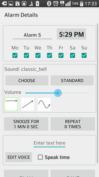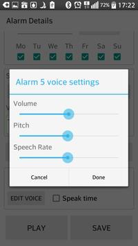 Custom Alarm Clock uses Android text-to-speech settings (i.e. engine, voice), but you can tune some voice parameters.