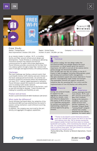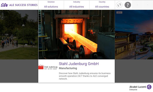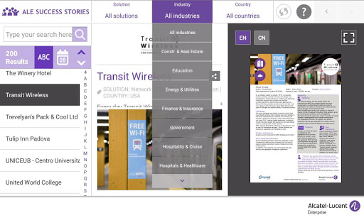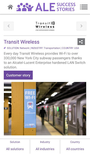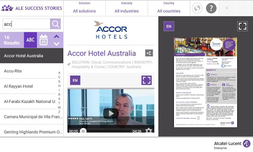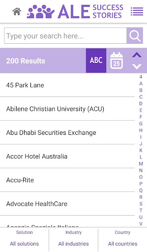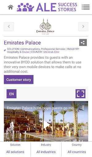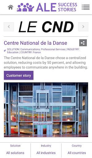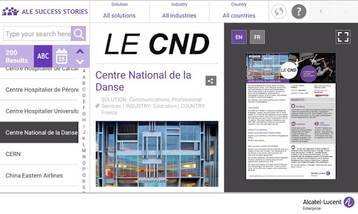This application enables any user to access ALE International customer reference list, related case studies and videos, sort the assets by country, industry, solution, and publication date