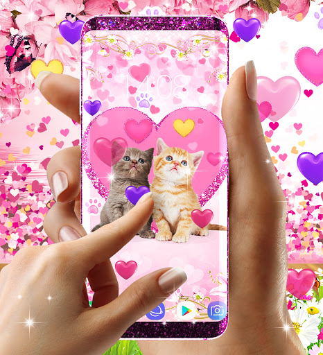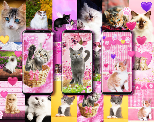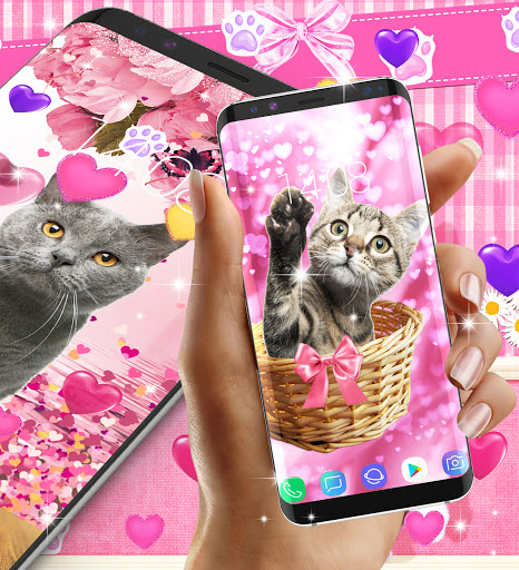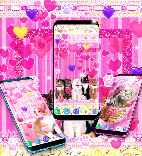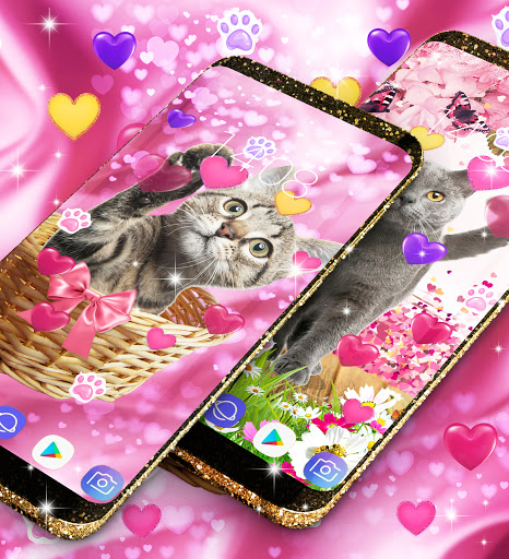 Cute pink kitty live wallpaper is a sweet app with pink backgrounds and lovely hearts. You will find pink, yellow and purple hearts elements . Hearts will fall over the screen. You can choose what color of the hearts that drop.