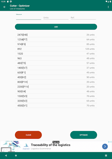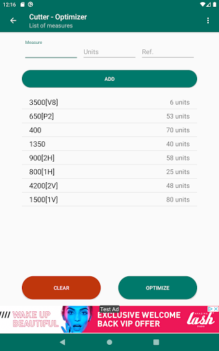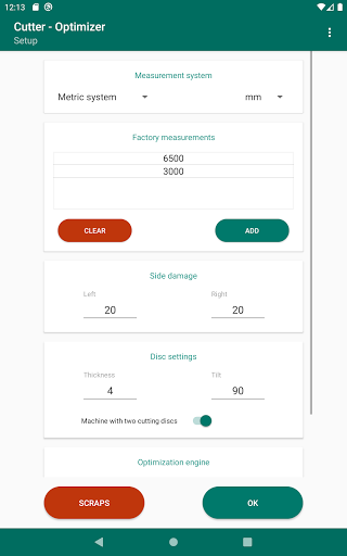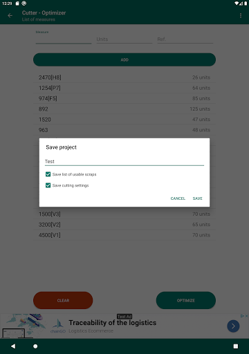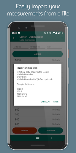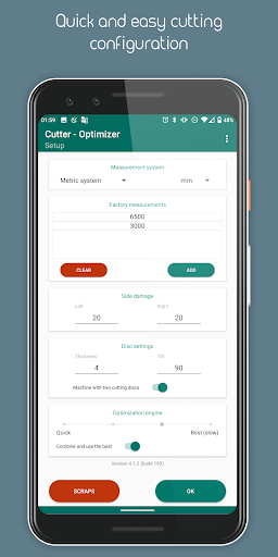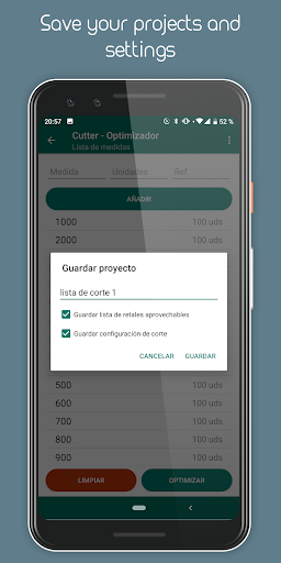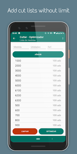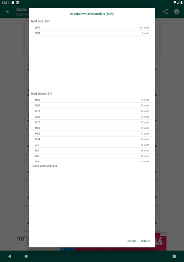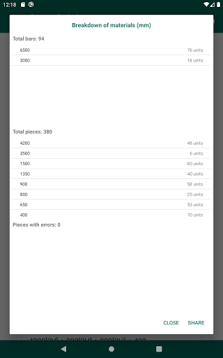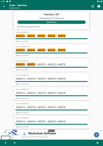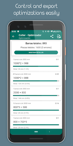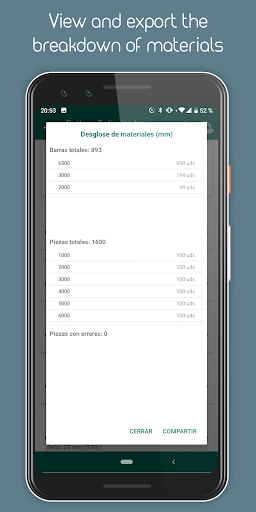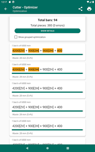 The cutting optimization will be shown grouped in the number of bars whose cuts are identical, being able to mark each element of the list (using a long press) to control at all times which material has been cut.