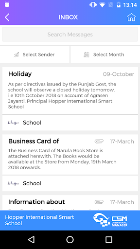 Daily Class Work and Home Work is updated on the App so that parents needs not to rely on the conventional- old fashion school diary mode. Special Message on some special topic can be sent to Individual Parent.